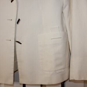 A refined take, this off-white blazer by Salvatore Ferragamo brings timeless sophistication to any capsule wardrobe. Crafted from cotton with a fully lined interior, the piece features a structured yet feminine silhouette with sharp notched lapels and unique toggle-style front closures. Dual front patch pockets are accented with stitched tab details, and subtle back vents at the sleeve cuffs offer an elegant finish.