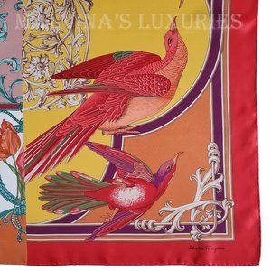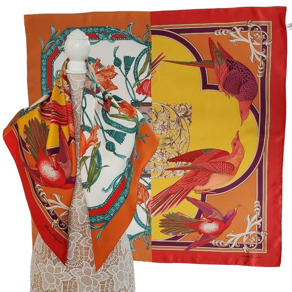 Unique Features: This soft scarf is 100% Silk Twill with Two contrasting color Prints representing flowers and birds. This sophisticated print comes from the Ferragamo Archives, a contemporary reinterpretation of a strong heritage.