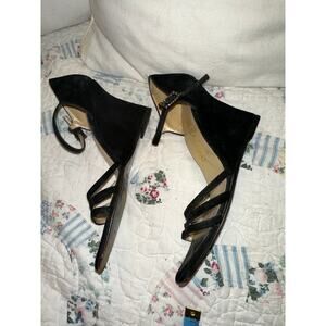 BLACK SUEDE SANDALS WITH HIGH WEDGE HEEL FROM FERRAGAMO. RHINESTONE BUCKLES ON STRAPS. 7.5 AA. GREAT CONDITION! ONE OF THE BUCKLES IS COMING A LITTLE LOOSE AND CAN USE STITCHING