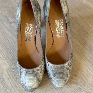 Beautiful grey Salvatore Ferragamo python round-toe platform pumps with silver accents on the chunky heel! Shoes are in great used condition with wear on the soles and a slight greenish tint at the top of one heel. See all pics for details! Shoes come with the original dust bag and box.