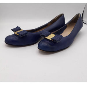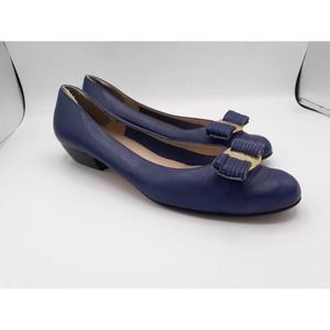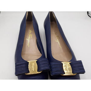 Pre-loved but in great condition with minor signs of wear at toe and heel. Beautiful blue leather with top buckle bow and center signature accent. 1" wood stack heels and removable inner back heel protector. Size 7.5 A