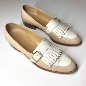 Step out in style with these elegant cream loafers. Featuring a chic fringe detail and a classic buckle, these shoes are perfect for any occasion.