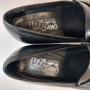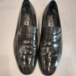 Salvatore Ferragamo men's size 9 EE black leather classic penny loafer made in Italy. Nice looking shoes by luxury shoemaker Ferragamo in good condition with some typical preowned creases, scratches & wear. Priced to sell at 90% off Ferragamo current loafer pricing...MSRP $750>. Save nearly $700 buying preowned & make these yours...before someone else makes them theirs. The Salvatore Ferragamo XL (snug fit) cedar shoe trees shown in the photos can be purchased with the shoes for an extra $29. Thanks for looking.