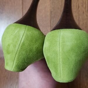 SALVATORE FERRAGAMO heels. Beautiful green fresh color. Leather and suade mix. Used only few times. I had cobbler put slide protection grip ($50) to put on the bottom. Great with white pants or summer dress. Make a reasonable offer. Heels approximately 3" inches Size 9B. <>