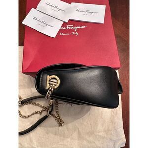 Black calfskin Salvatore Ferragamo Rosett crossbody bag with gold-tone hardware, single chain-link shoulder strap with leather shoulder guard, tonal leather lining, single interior zip pocket and magnetic snap closure with fold-in-flap closure at front. Exterior and interior black calfskin leather.