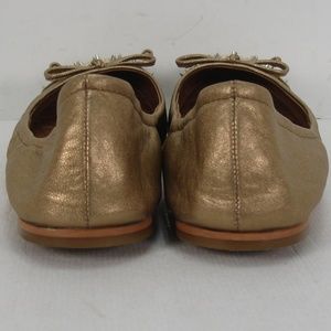 Description: Sam Edelman gold shimmer leather slip on ballet flats shoes, satin cap toe with spikes studs and leather bow, slightly elasticized back side topline, quilted padded footbed, leather lining.