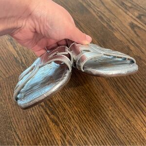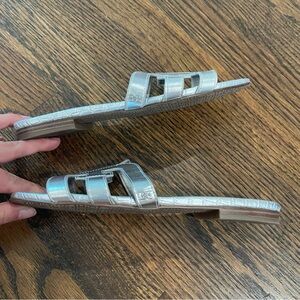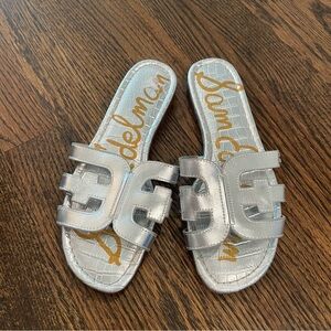 These Sam Edelman sandals are in good used condition. Silver leather. Bay slide sandals. Size 7.