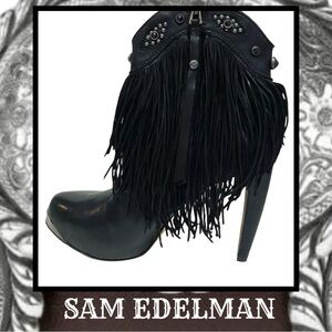 SAM EDELMAN Black Leather Bootie Fringe Heel Platform Bootie 9.5 NEW