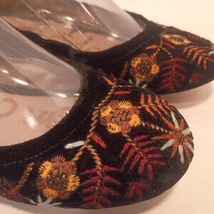 So very pretty and absolutely perfect for fall and those earthy colors and warm textures you want to add to your wardrobe! From SAM EDELMAN, the "Farrow" black velvet ballet flat with earth-tone embroidered floral detail and gold touch at the heel. With leather insole and padding, feel like a dream to wear! Women's size 7 US or 37 EU. In super nice condition, appear barely worn if at all. Please see photos. Perfect addition to your seasonal wardrobe!