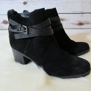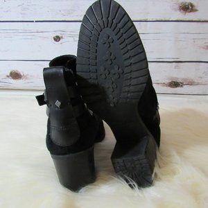 A distressed suede finish and a block stacked heel emphasize the rustic, downtown-chic vibe of this bootie. Criss-crossed ankle wrapped belts and a lug sole further the boho attitude.