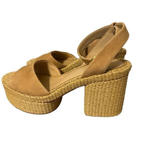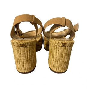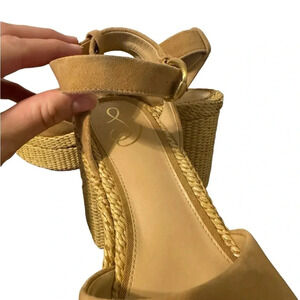 Elevate your summer style with these Sam Edelman platform sandals featuring a woven raffia wedge and soft tan suede strap. The perfect mix of casual elegance and boho-chic comfort for any sunny occasion!