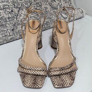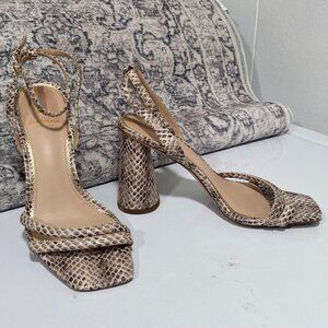 Snakeskin texture in gray, tan colors, open toe, ankle strap with buckle closure