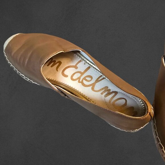 An earthy braided jute wrapped platform grounds this Kesia Espadrille flat by SAM EDELMAN. Extra cushioning at the heel for all day comfortable. Leather upper with rubber sole. Sole is dirty but insole and upper are in excellent condition.