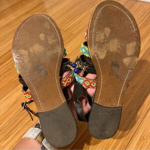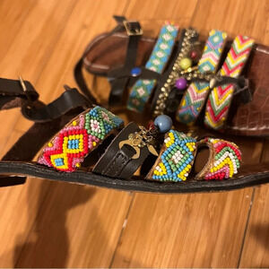 The straps remind me of summer camp friendship bracelets! Shoes are missing the big pearl detail near toe but all other bobbles remain intact. Some wear to faux leather straps, see photos. Gently worn, offers welcome!