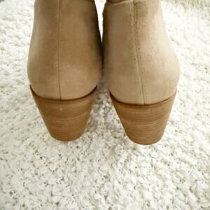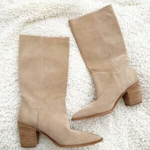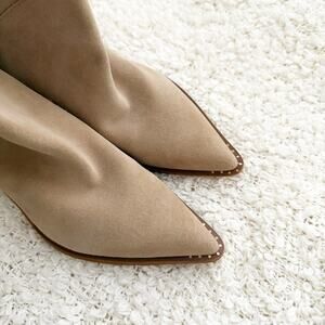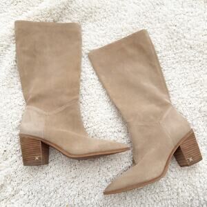 Amazing pair of pointed-toes boots from SAM EDELMAN! Size 9.5, tried on but never worn. Tan suede leather upper, manmade sole. ight brown stacked heel and sole. Pull on style, no zip.