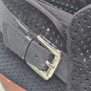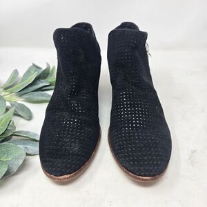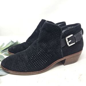 Perforated low block heel suede booties with strap and buckle at the ankle. They are a women's size 7.5. The heel measures approximately 2". They have some scuffing on the heels as shown in the photos. Please see all photos as this is the exact pair you will receive. Thank you for looking. I am always open to reasonable offers. Have a fantastic day!