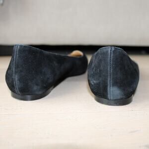 These black suede ballet skimmer flats offer a modern take on a classic silhouette, featuring a dainty teardrop keyhole detail at the vamp. With a softly pointed toe, smooth leather backstay, and cushioned footbed, they blend everyday comfort with understated elegance. Ideal for work or casual wear, these flats slip on with ease and pair effortlessly with everything from trousers to dresses.