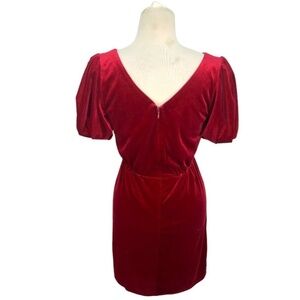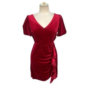 Details: Soft velvet fabrication lends a lavish look to this mini dress. It is styled with puffed sleeves, ruching and a cascading ruffle in the front.