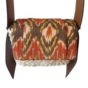 Never used stylish crossbody bag woven of corn husk straw and beautiful stitching vegan leather trim