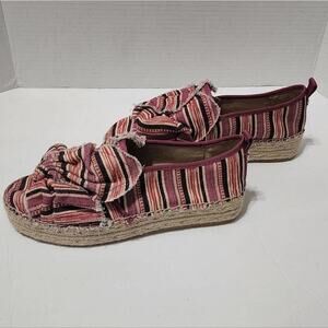 Keywords: Sam Edelman, espadrille, slip on shoes, striped, ruffle detail, casual shoes, comfortable shoes, summer shoes, women's footwear, bohemian style, beach shoes, vacation shoes