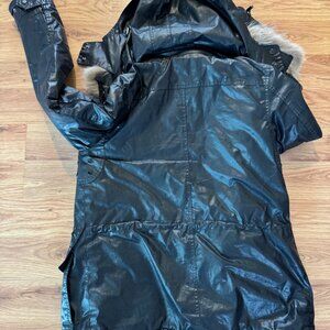 Fair condition. Some wear and tear on the coat. Hole near pocket (as shown) and the loop by the tag needs to be sewn back on (as pictured). The jacket is a dark green / greyish color. Really unique!