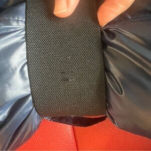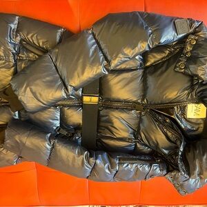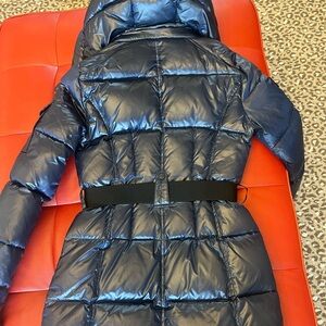 Very good used condition, minor wear on one sleeve and belt as shown in photos. Two-way zipper, detachable hood. Down filled. Size small but fits like an extra small. Dark blue.