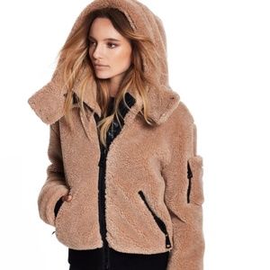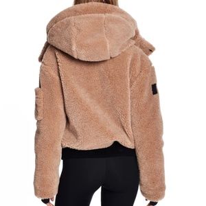 Stylish tan bomber jacket by SAM. Features cozy hood and black zipper accents. Perfect for casual wear.