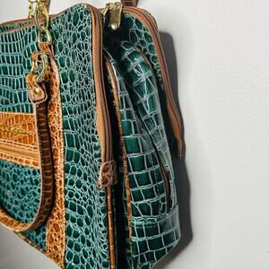 SAMANTHA Emerald Green Brown Croc Embossed Leather Three Compartment Travel Tote