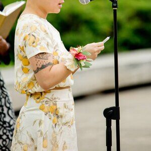 The cutest matching silk set with all-over citrus garden print. The silk is SO soft.