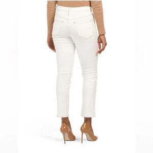 waist rise: 10.5in, fabric provides stretch ankle length, slim straight leg, 5 pocket style high rise waist