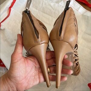 SAM EDELMAN LEATHER TAUPE STRAPPY SANDALS. HEEL IS 4.75 INCHES. BEAUTIFULLY PADDED INSOLES. FRONT IS BEADED FOR A GORGEOUS, CHIC LOOK. NEW
