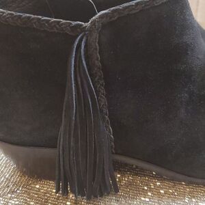 With just the right amount of fringe to make a sophisticated statement, this soft suede bootie features braided detailing along the topline, an almond toe and a stacked heel.