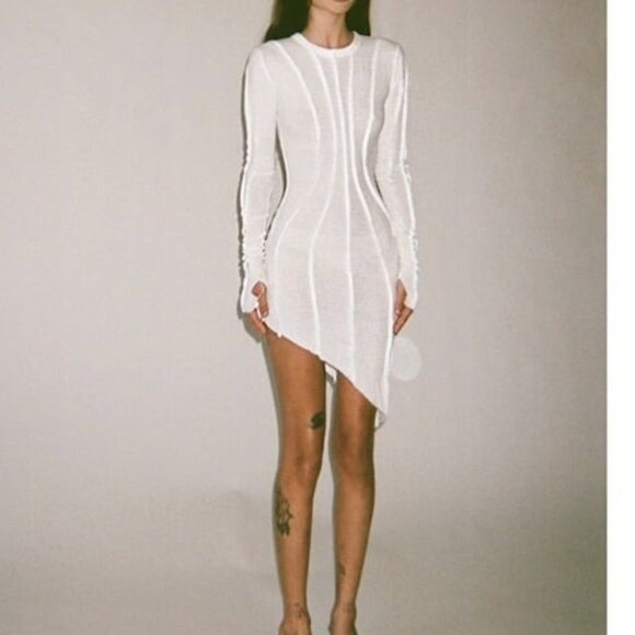 SAMI MIRO VINTAGE Asymmetric Baby Rib Mini Dress in White long sleeve bodycon