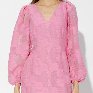 Pink ‘Anai’ dress with puff sleeves from Samsoe Samsoe. Crafted from fabric with a jacquard floral motif, this design features a concealed back zip, V-neck with drawstrings and transparent puff sleeves.