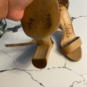 Elevate your style with these chic tan stiletto heels from SAM. Featuring a minimalist design, they boast a wide front strap and a secure ankle buckle closure. Crafted with a sleek silhouette, these heels are perfect for adding a touch of elegance to any outfit.