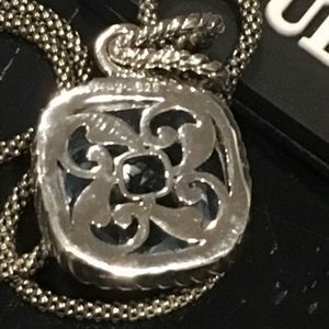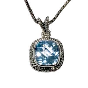SAMUEL B Sterling Silver Popcorn Necklace and Blue Topaz Cushion Cut Pendant With Rope Detail