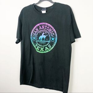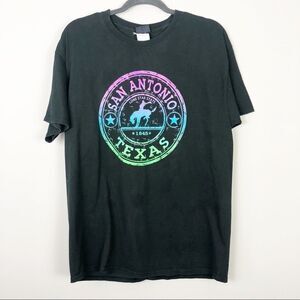 Such a cool tee! Black unisex short sleeve T-shirt with colorful Converse-like graphic for San Antonio Texas. Love the gradient coloring. Great preowned condition.