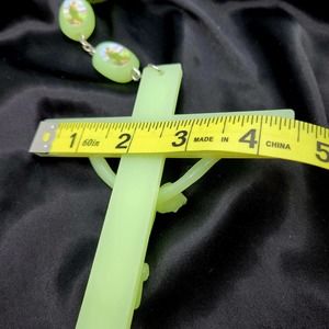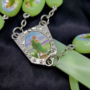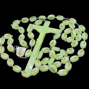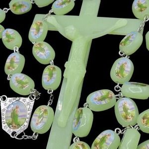 Large Wall rosary glow in the dark Wall Catholic Decor SaintJude ".The beads are very large like approximately 15mm each having flat Oval beads. .The rosary is 52 inches total. The measurement are shown in the pictures. Its a beautiful wall decor. The rosary has a pretty good weight to it. The beads are connected with metal links. It can be put up on the wall in a prayer nook .