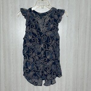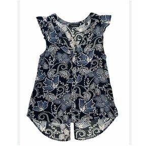 Elevate your style with this elegant navy blue paisley top. Featuring delicate ruffle sleeves, it's perfect for any occasion.