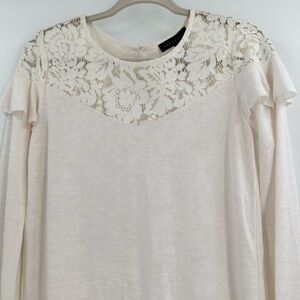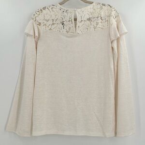 Beautiful cream color lightweight sweater w/sheer lace detail at top with ruffle caps on long, slight bell sleeves.