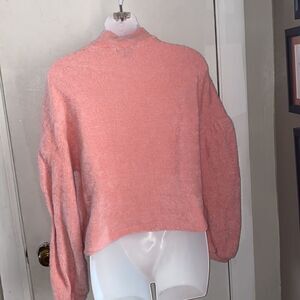 Washable polyester nylon in a peachy pink color for a soft feel with eyelash look, Mockneck, puckered shoulder detail. Size small, measures 22” from armpit to armpit and 20” from top of shoulder to bottom hem.
