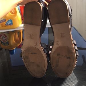 A pair of black and brown slide on sandals; size 5. They have only been worn once, however they have a small rip on the front left shoe.