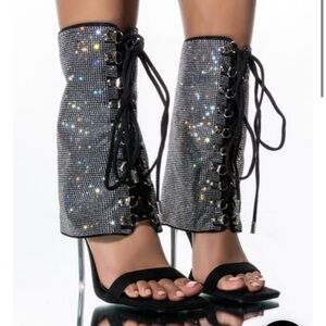 Get ready to party it up in The AZALEA WANG Out All Night Stiletto Sandal In Black! This trendy sandal-boot hybrid features a rhinestone-encrusted suede fabric upper, a mid-calf shaft height, a cushioned insole, and a slim acrylic stiletto heel. Complete with a square open toe, toe strap, and lace up front closure. Fit and details (approx. measured from a women’s 7.5): - All man made materials - Square open toe - Stiletto heel - 9.5" shaft height - 4.5" heel height