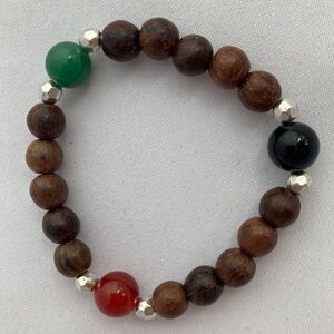 Stretch Beaded Bracelet with 8MM round sandalwood beads, a 10MM round green Aventurine bead, a 10MM red Carnelian bead, a 10MM black Onyx bead, and silver accent beads