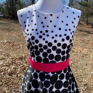 SANDRA DARREN DRESS SLEEVELESS FIT AND FLARE WHITE BLACK DOTS PINK WAIST BAND MOD RETRO SIZE 6