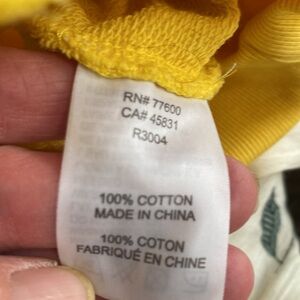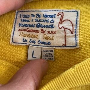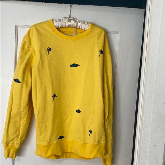 PRE-OWNED WORN TWICE SANDRIN ROSE YELLOW EMBROIDERED CREW NECK SWEATSHIRT. EMBROIDERY ON FRONT AND ON SLEEVES. INTENTIONAL DISTRESSING ON COLLAR, WAISTBAND AND CUFFS. 100 PERCENT COTTON. TAGGED SIZE LARGE. PTP IS APPROX. 23 1/2 INCHES. LENGTH IS APPROX. 27 1/2 INCHES AND SLEEVE LENGTH FROM SHOULDER SEAM IS APPROX. 25 INCHES.
