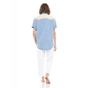 SANDRINE ROSE Western Floral Chambray Denim Top Pearl Snap Pockets Light Wash S