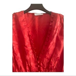 Sandro Azelie silk-blend mini dress (red) nwt. Sandro is revisiting the 70s to whip up its SS21 collection. Celebrating one of the decade’s favourite silhouettes, the sundress, the Parisian label crafts the Azelie mini from pure silk scattered with blooms and stitched with neat lines of buttons around the V-neckline as well as down the centre. Cut with cropped sleeves that puff out slightly, it’s a playful style to slip on in the sunshine with strappy sandals or under a leather jacket on cloud-covered days. Sandro silk-blend mini dress 53% silk, 47% viscose Concealed zip fastening at side V-neck, short puff sleeves, pleats at chest, all-over jacquard pattern, flared trim at hem Dry clean True to size