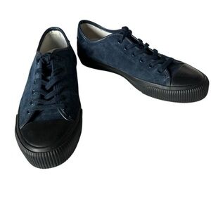 Sandro Leather Suede Low Sneakers. Navy blue suede with black trim low-top trainers from SANDRO PARIS featuring round toe, branded insole, front lace-up fastening, rubber sole, branded heel counter and black contrast stitching.