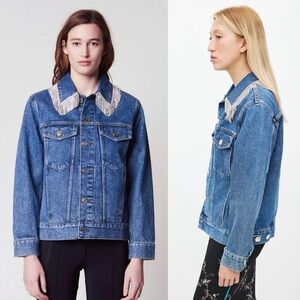 SANDRO Crystal Rhinestone Fringe Collar Oversized Denim Trucker Jean Jacket M